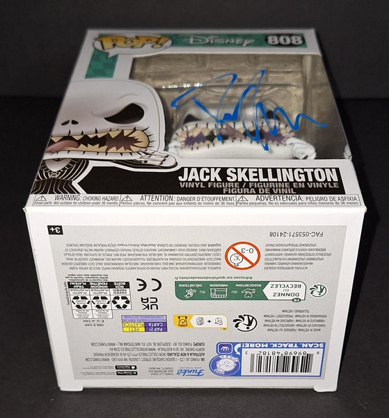 Signed in blue paint on a Disney The Nightmare Before Christmas Jack Skellington Funko. Beckett authenticated. Will come in a pop protector. There is an imperfection on the back please see the last photo.