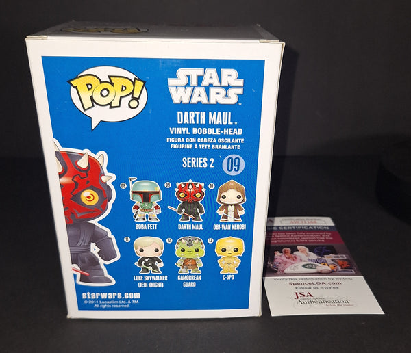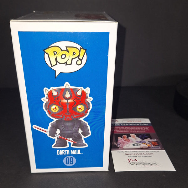 Signed in silver paint on Darth Maul Star Wars blue box Funko with "Sith Rule!" inscription. JSA authenticated. Will come with the hologram and matching card. Will come in a pop protector.