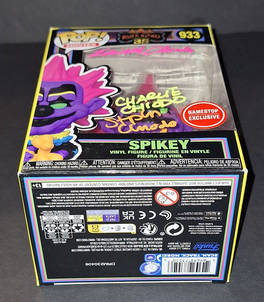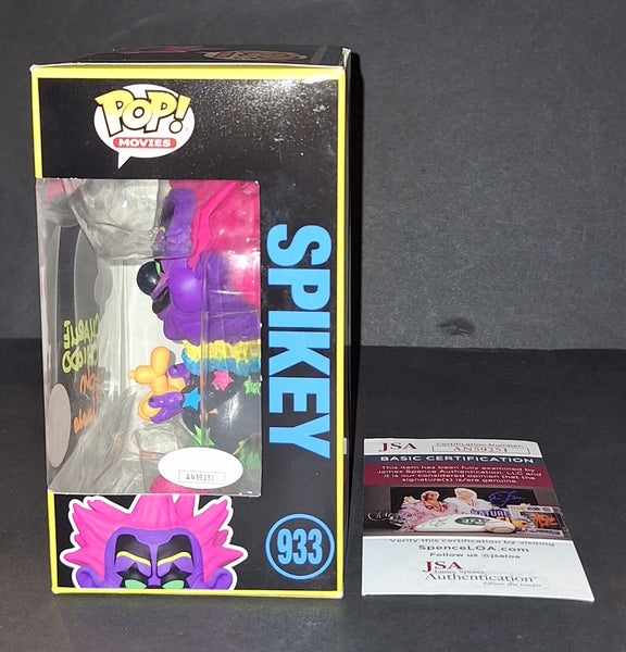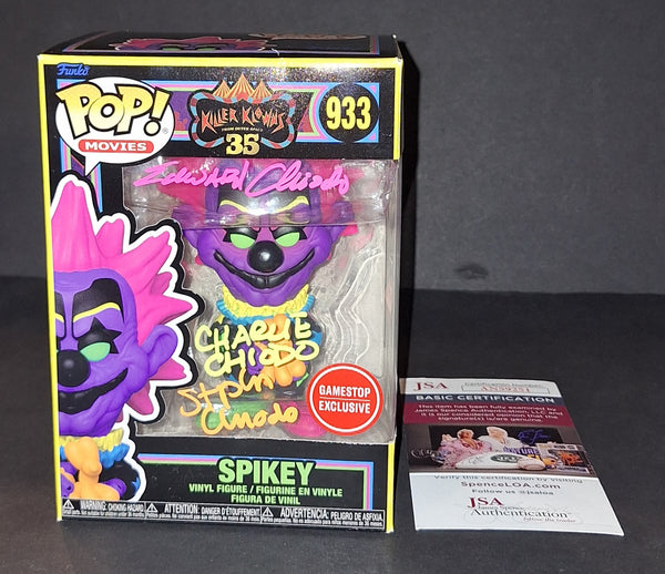 Signed by directors Charles Chiodo, Stephen Chiodo, and Edward Chiodo on a Spikey Killer Klownz from Outer Space Gamestop Exclusive blacklight Funko. JSA authenticated. Will come with the hologram and matching card. Will come in a pop protector. There is a small imperfection please see the last photo.