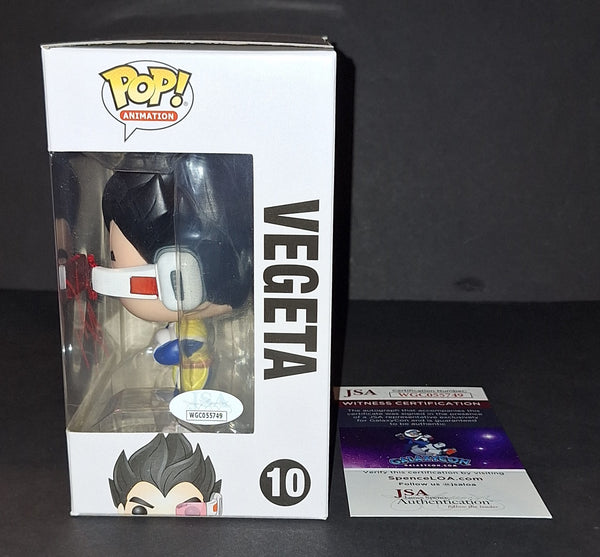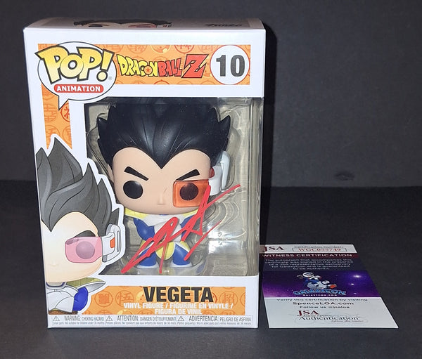Signed in red paint on a Vegeta Dragon Ball Z Funko. JSA authenticated. Will come with the hologram and matching card. Will come in a pop protector.