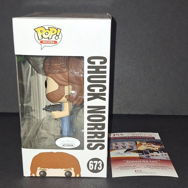 Signed in green paint on a Target Exclusive Chuck Norris Funko. JSA Witness authenticated. Will come with the hologram and matching card. Will come in a pop protector. There is a small corner imperfection please see the last photos.