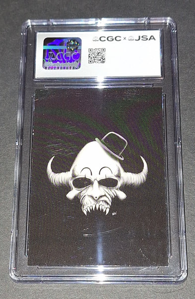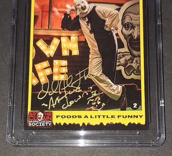 Signed in gold paint on a custom Art the Clown Terrifier card with "Art the Clown" inscription and clown face sketch. CGC/JSA authenticated and encapsulated.