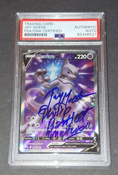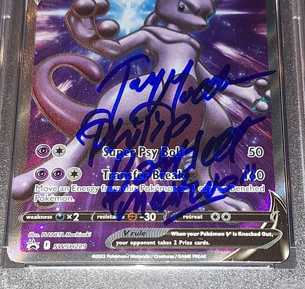 Signed in blue on a 2022 Black Star Promo MewTwo Pokémon GO Elite Trainer Box card with "MewTwo" inscription. PSA authenticated and encapsulated.