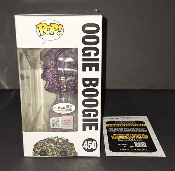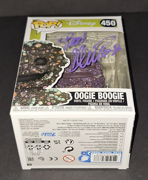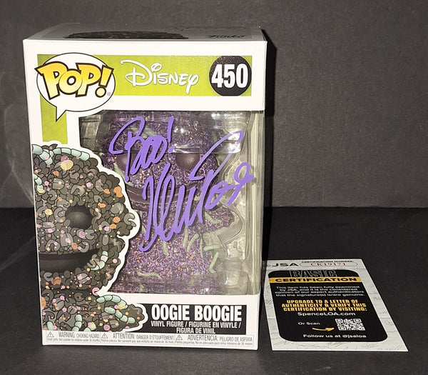 Signed in purple paint on an Oogie Boogie Nightmare Before Christmas Disney Funko with "Boo!" Inscription. JSA authenticated. Will come with the hologram and matching card. Will come in a pop protector.