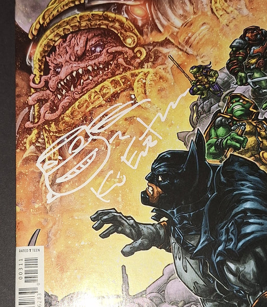Signed in white paint on a Teenage Mutant Ninja Turtles and Batman III comic with turtle head sketch. Beckett authenticated. Will come with the hologram and matching card.