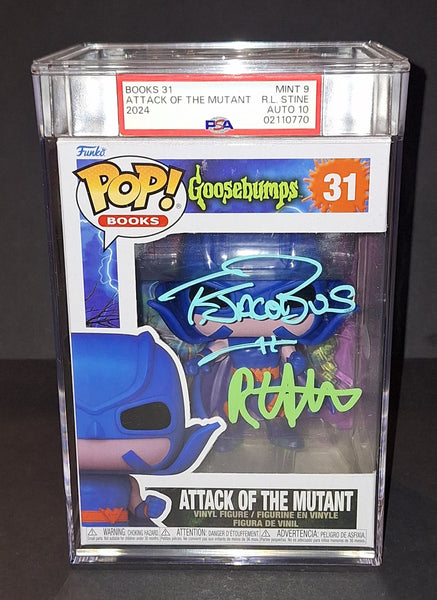 Signed in green and blue paint on a Goosebumps Attack of the Mutant Funko. JSA authenticated and PSA encapsulated and graded Mint 9.