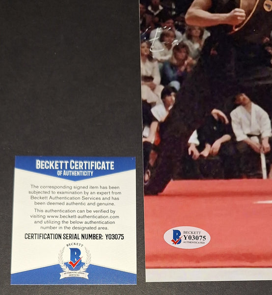 Signed in silver paint on a Karate Kid photo. Beckett authenticated. Will come with the hologram and matching card. Will come in a toploader. There see a few very small imperfections please see the last photo.