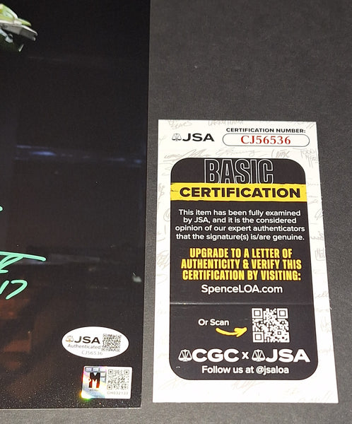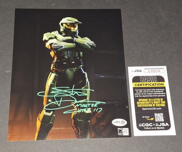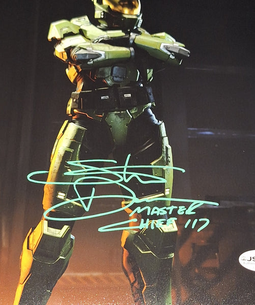 The voice of Master Chief in Halo 1-3. Signed in green paint on a Halo photo with "Master Chief 117" inscription. JSA authenticated. Will come with the hologram and matching card. Will come in a toploader.