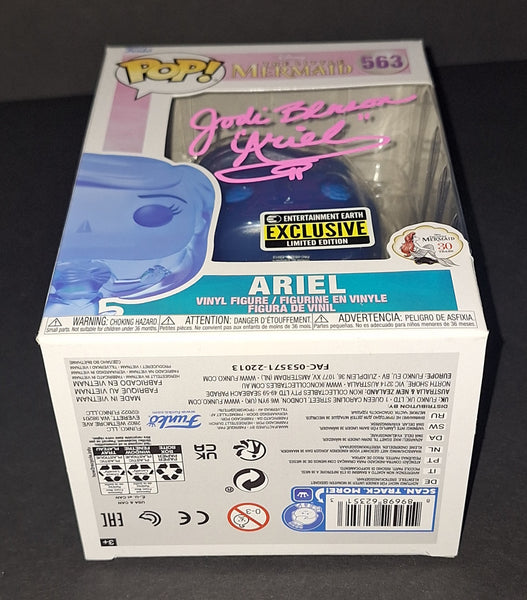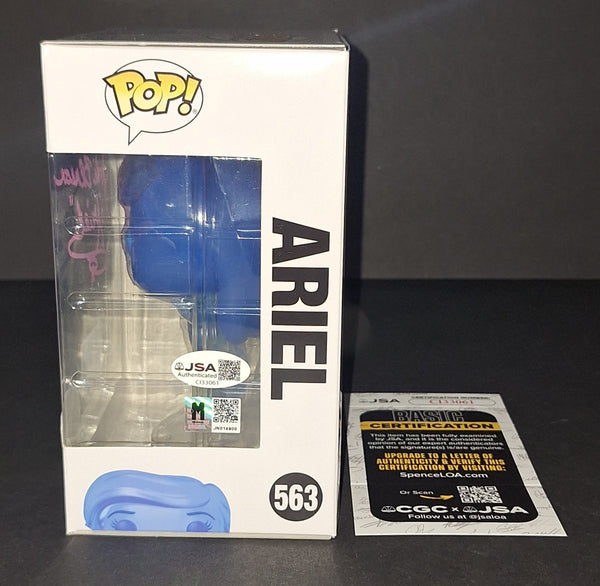 Signed in pink paint on a Disney The Little Mermaid 30 Years Ariel Entertainment Earth Exclusive Funko with "Ariel" inscription. JSA authenticated. Will come with the hologram and matching card. Will come in a pop protector.