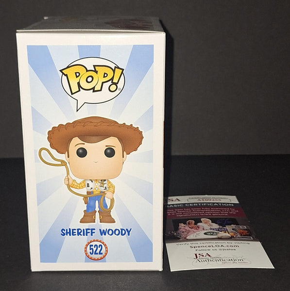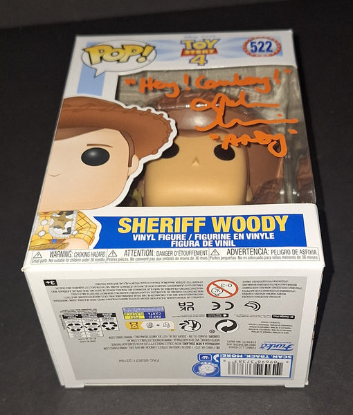 Signed in orange paint on a Disney Pixar Toy Story 4 Sheriff Woody Funko with "Hey! Cowboy!" and "Andy" inscriptions. JSA authenticated. Will come with the hologram and matching card. Will come in a pop protector.