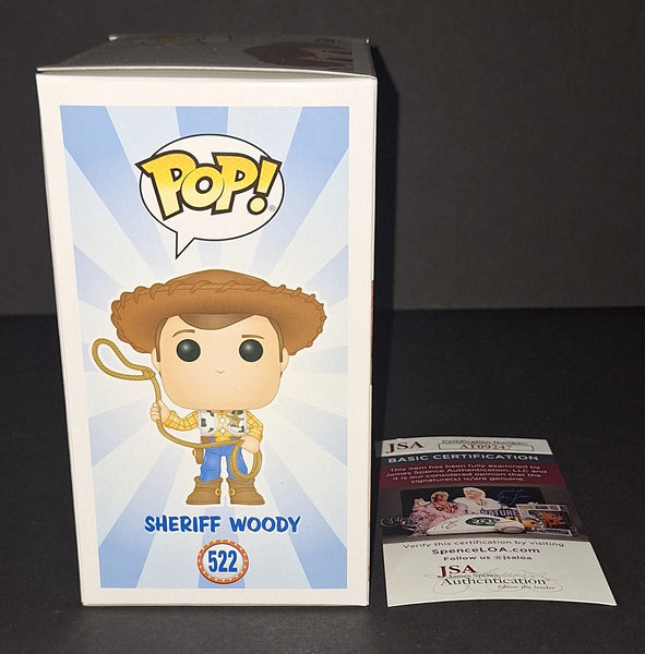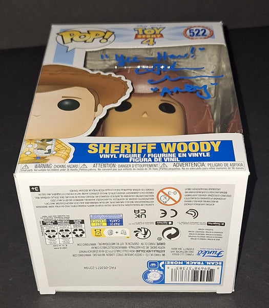 Signed in blue paint on a Disney Pixar Toy Story 4 Sheriff Woody Funko with "Yee-Haw!" and "Andy" inscriptions. JSA authenticated. Will come with the hologram and matching card. Will come in a pop protector.