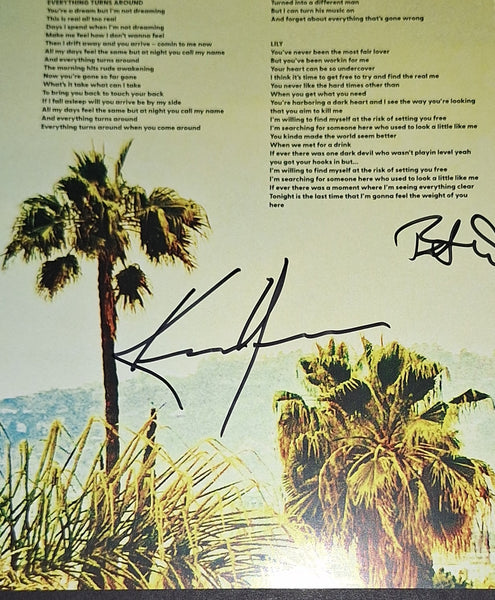 Triple signed in black on a Dogstar "Somewhere Between the Power Lines and Palm Trees"  lyrics sheet by Keanu Reeves, Robert Mailhouse, and Bret Domrose.  JSA authenticated. Will come with the hologram and matching card. Full Dogstar album. There are some small imperfections please see the last photos.