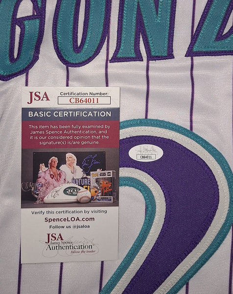Signed in silver paint on a large Arizona Diamondbacks jersey with "2001 WS Game 7 GW Hit" inscription. JSA authenticated. Will come with the hologram and matching card.