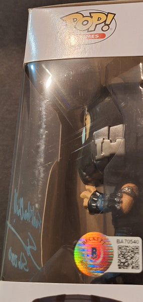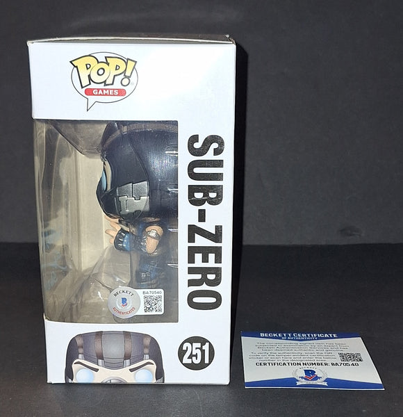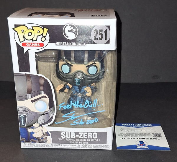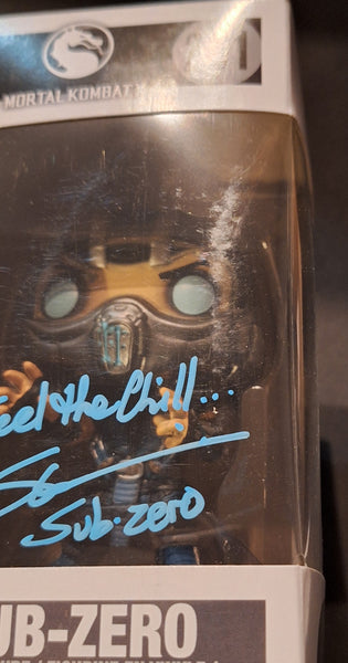 Signed in blue paint on a Sub-Zero Mortal Kombat X Funko with "Feel the Chill..." and "Sub-Zero" inscriptions. Beckett authenticated. Will come with the hologram and matching card. Will come in a pop protector. There are some imperfections please see the last photos.